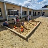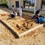 Espace bac à sable : Seaux, pelles et voitures pour les architectes en herbe.