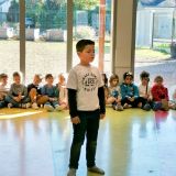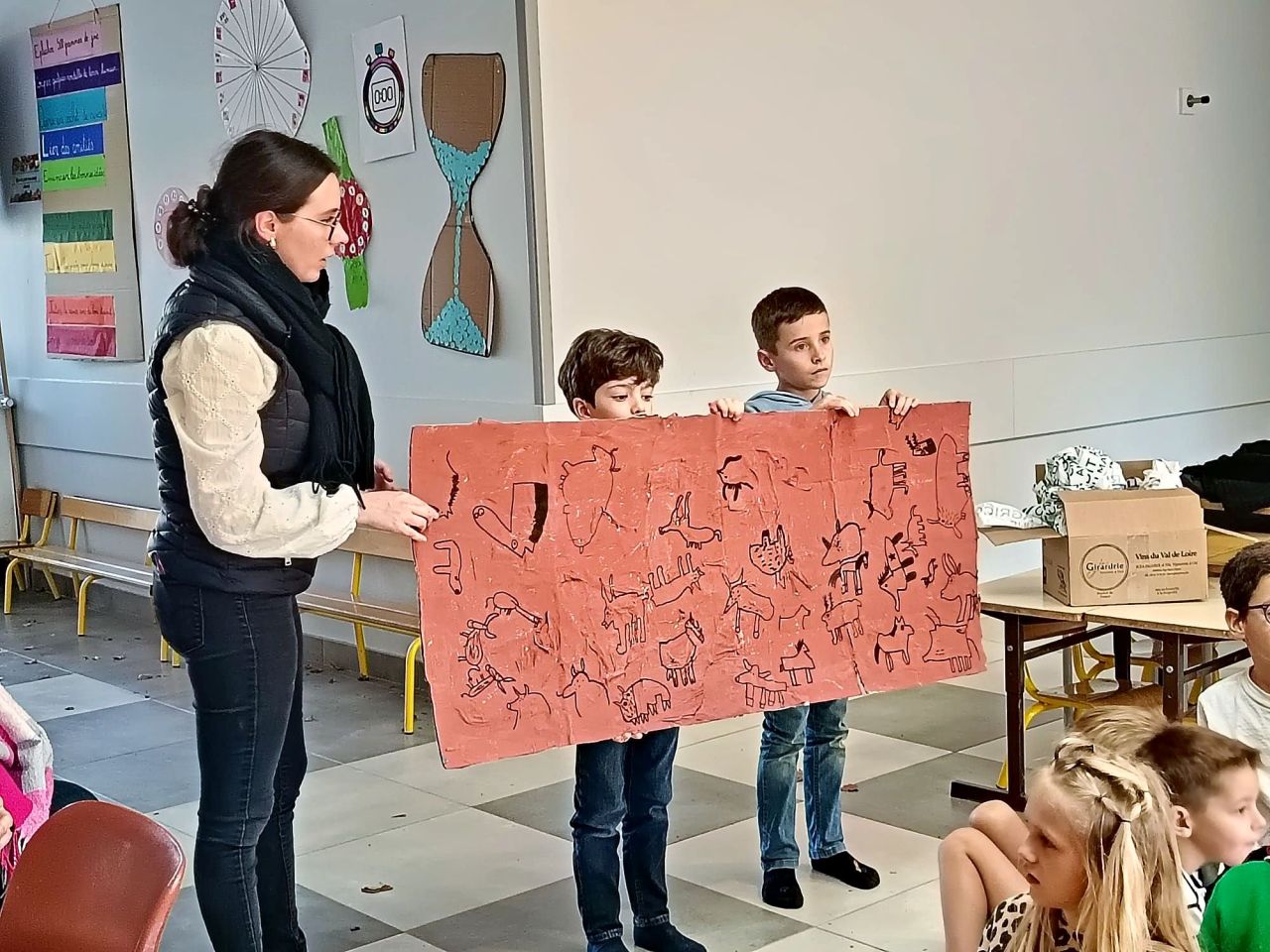 La classe de Deborah a défilé avec sa fresque de reproduction de la grotte de Lascaux après avoir écouté la poésie de Lucas.
